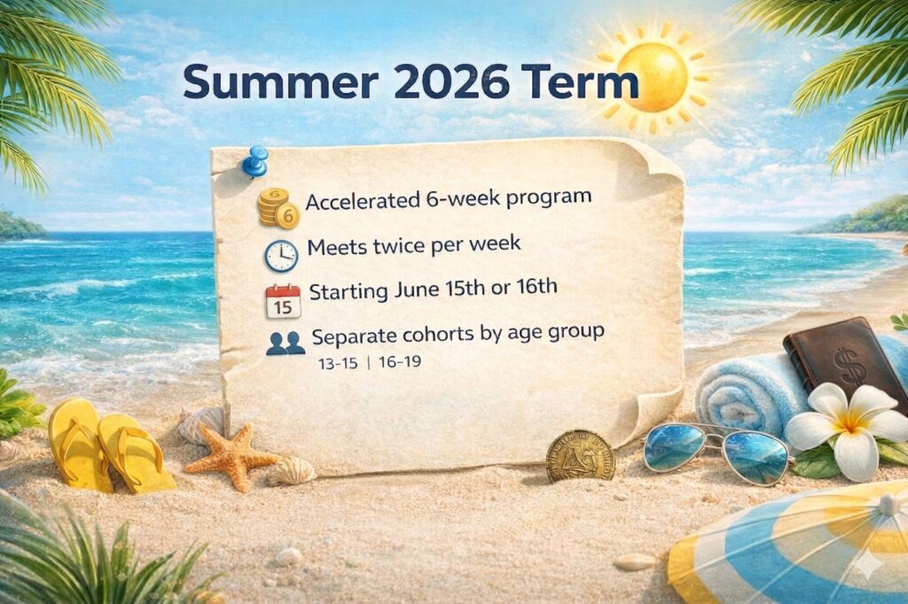A live, small-group coaching course helping teens ages 13–19 build confidence in money, investing, and entrepreneurship—Summer 2026 Term starts June 15th, 2026.